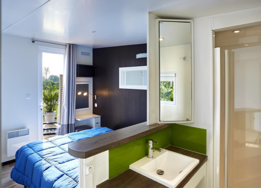 Für große Familien und Gruppen von 6 oder 7 Personen stellen wir Ihnen schöne Mobilheime mit 3 Schlafzimmern zur Verfügung, die voll ausgestattet sind. Die Residenz Taos Prestige (6 Personen, 38 m2) gleicht mit ihrem zeitgenössischen Design einem Architektenhaus. Dieses Mobilheim der neuen Generation verfügt über drei Schlafzimmer (1 Hauptschlafzimmer mit Doppelbett, 1 Schlafzimmer mit 2 Einzelbetten, 1 Schlafzimmer mit Etagenbett), zwei Badezimmer und luxuriöse Annehmlichkeiten, darunter ein TV und ein Geschirrspüler.